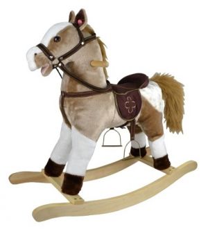Heboučký houpací kůň po zmáčknutí ouška řehtá a hýbe ocáskem. Po zmáčknutí druhého ouška vydává zvuky klapotu podkov při klusu a hýbe ocáskem. Baterie se vkládají do pouzdra umístěného na bříšku. Hračka pomáhá dítěti rozvíjet koordinaci pohybů a podněcuje jeho představivost. Návod na sestavení a vložení baterií je uvnitř krabice. 3ks baterií AA nejsou součástí balení.