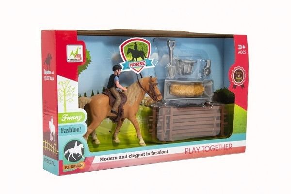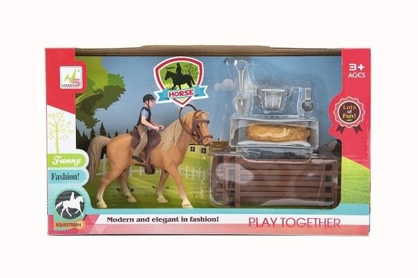 Kůň + panáček žokej plast s ohradou s doplňky v krabici 33x19x5,5cm