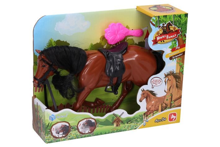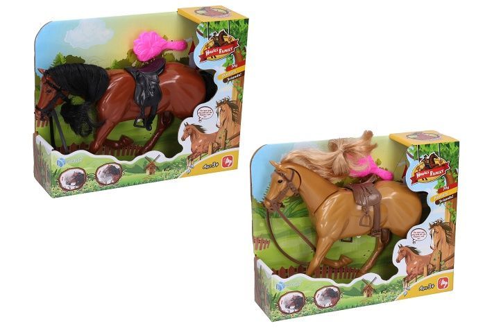 Kůň s hřebenem a zvukovými efekty. Velikost 26 cm. Zvukové efekty předkloněním hlavy. 2xAG13 baterie součástí. 2 varianty - tmavě hnědý, světle hnědý.