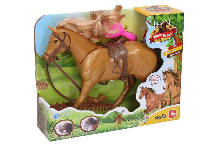 Kůň s hřebenem a zvukovými efekty. Velikost 26 cm. Zvukové efekty předkloněním hlavy. 2xAG13 baterie součástí. 2 varianty - tmavě hnědý, světle hnědý.