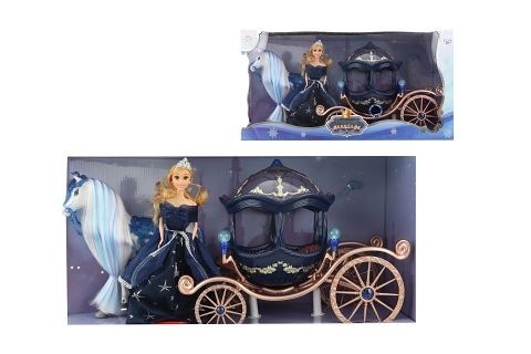 Krásný velká sada pro holčičky obsahuje panenku, koně a kočár. Materiál je plast. Kočár je napájen na 3 AG13 baterie(jsou součástí balení) a po zapnutí blikají světla. Kůň je napájen na 3 AA baterie(nejsou součástí balení) a po zapnutí chodí. Baleno v krabici. Rozměry balení cca 63,5x33x21,5 cm. Věk 3+