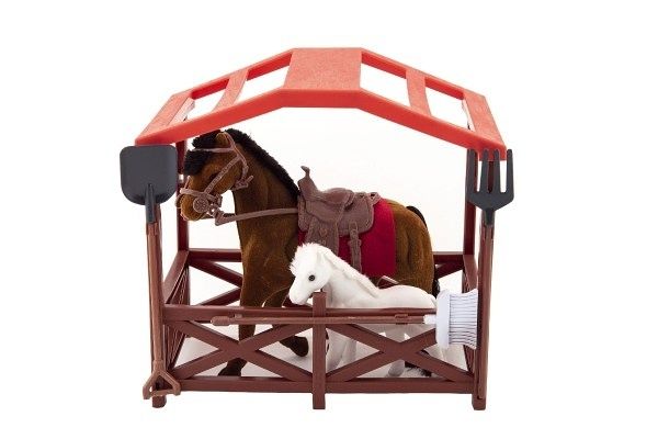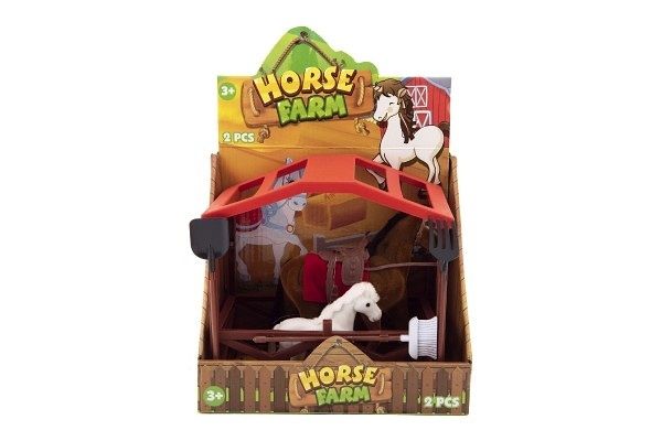Kůň se sedlem a ohlávkou pro všechny obdivovatele a milovníky koní. Kůň je 15 cm velký, plastový, s povrchovou úpravou fliška. V balení také naleznete hříbátko též s povrchovou úpravou fliška. Mají také svojí ohrádku s doplňky jako jsou vidle, či lopata a koště. Figurky využijete například při hraní na vaší farmě.