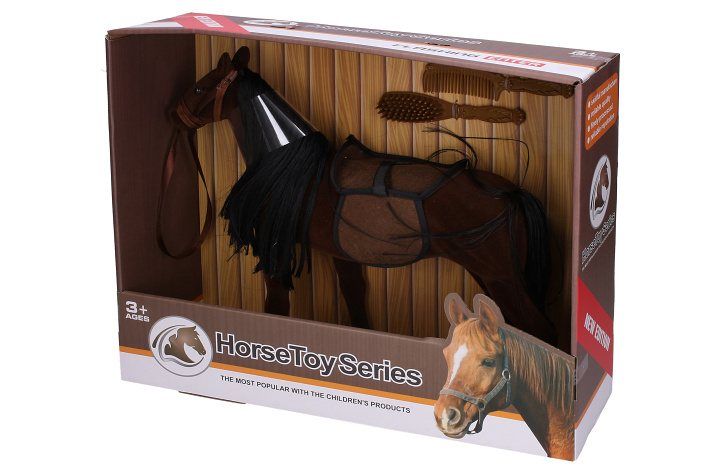 Kůň tmavý. Velikost 35cm. Obalení obsahuje koně se sedlem a dva hřebeny.