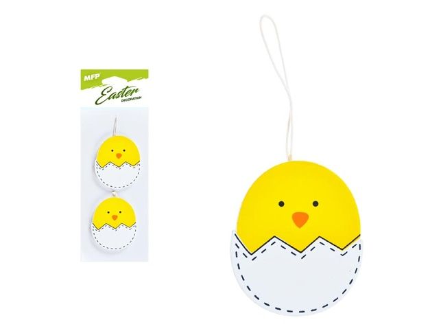 Velikonoční dekorace dřevěná - závěs s motivem kuřete ve skořápce 2 ks - Vyzdobte si byt velikonočními dekoracemi a přivítejte tak svátky jara. Tuto dekoraci můžete použít na dekorování velikonočních věnců nebo větviček. BALENÍ OBSAHUJE: - 2 ks dekorací (kuře) Barva: žlutá a bílá Velikost: 6,5 cm Dekorace má provázek na zavěšení. Uvedená cena je za 1 balení.