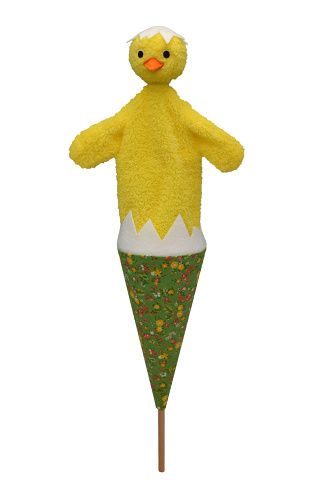 Kornoutový maňásek "3v1" = loutka+maňásek+schránka na drobnosti. Ovládá se dřevěnou tyčkou, kterou také schováte celou postavičku do kornoutu. Otvorem na zádech ovládáte ruce, tak jako u maňásků, nebo vložíte drobné dárky do kornoutu.