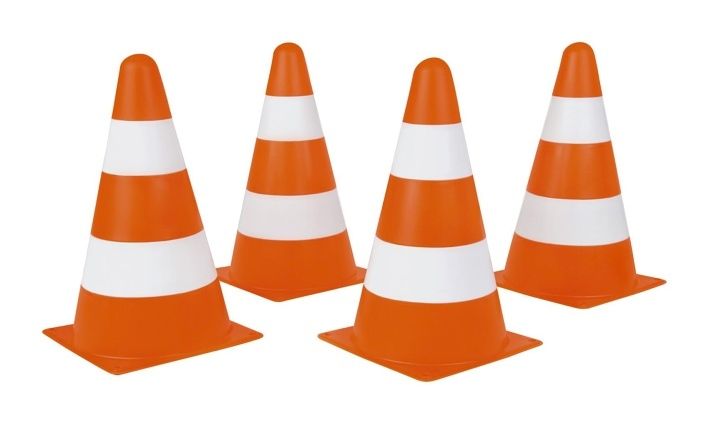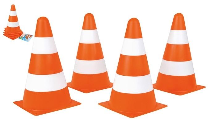 Sada 4 dopravních kuželů, které mohou být použity například na dětském dopravním hřišti, a to pro výuku bezpečnosti silničního provozu. Děti se s pomocí kuželů mohou naučit vyhýbat překážkám. Kupte dětem dopravní kužely!