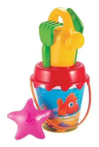 Kyblíček na písek s obrázkem rybičky. Sada dále obsahuje síto, hrabičky, lopatičku, konvičku a formičku ve tvaru hvězdice. Výška kyblíčku cca 14 cm, z plastu.