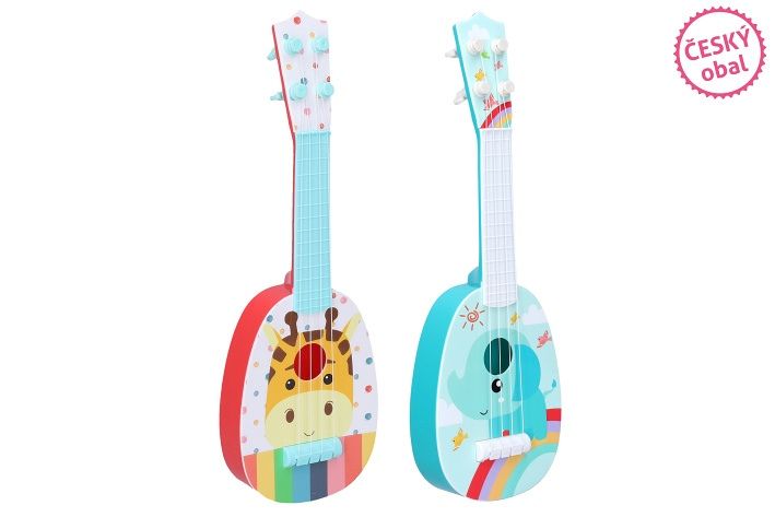 Kytara dětská, motiv africká zvířata. 4 umělé struny. Délka 37 cm. 2 varianty - slon, žirafa.