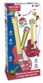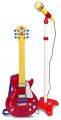 Elektronická rocková kytara s mikrofonem. Nastavitelný mikrofon, kytara má 6 kovových strun, 5 přednastavených rockových písní. Automatické vypíná proti vybití baterií. Popruh. Provoz na baterie 2 R6/AA 1,5V. Rozměry 22,5×22,5×120 cm. Na baterie: 2x AA (nejsou součástí balení)