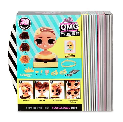 Rozbal 30 překvapení! Na O.M.G. Česací hlavě si můžeš vyzkoušet nekonečně mnoho účesů. V balení najdeš 14 různých příčesků pro dokonalý účes a více než 10 doplňků, kterými doladíš ten správný look. Přejeď ledovou kostkou po obličeji O.M.G. Česací hlavy a na tváři se jí objeví nový make-up. Podstavec Česací hlavy je otočný a můžeš do něj uložit doplňky.