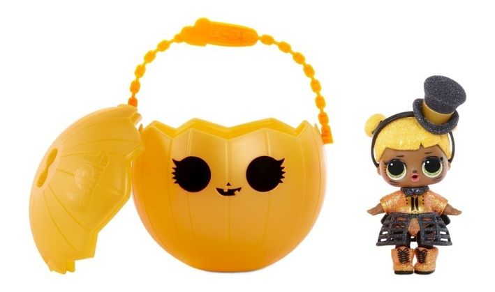 a odvážné rysy. Obal v podobě dýně slouží jako stojánek pro vystavení panenky.