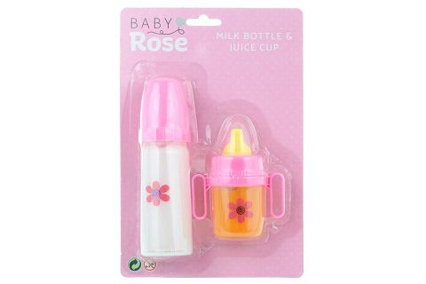 Lahvička s mlékem pro panenky o velikosti cca 14 cm a hrneček s džusem pro panenky o velikosti cca 8 x 10 cm.Věk 3+
