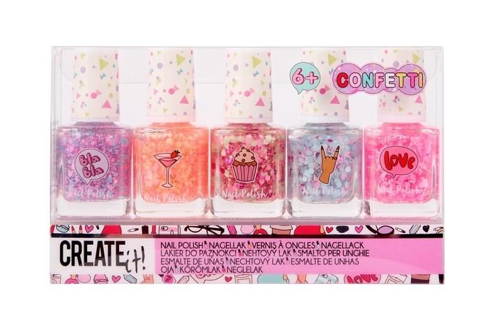 Párty může začít, protože třpytky jsou tady! Create it! Nail Polish Confetti Set promění tvé nehty v zářivá umělecká díla plná barev a lesku. Každý z pěti laků má jiný odstín s konfety efektem, který dodá tvému stylu hravý a originální vzhled.Zvolíš každý nehet jinou barvou, nebo se rozhodneš pro jeden odstín na obě ruce? Fantazii se meze nekladou! Můžeš si s kamarádkami uspořádat i zábavnou hru – vyber si barvu poslepu a nech se překvapit, jaký výsledek vznikne.Produkty Create it! jsou dermatologicky testované, bez parabenů a nejsou testované na zvířatech, takže jsou bezpečné a vhodné pro dívky ve věku 6 až 14 let. Obaly jsou vyrobeny z recyklovatelného PET a FSC certifikovaného papíru, a jejich veselý design podporuje kreativitu, hravost a sebevyjádření.