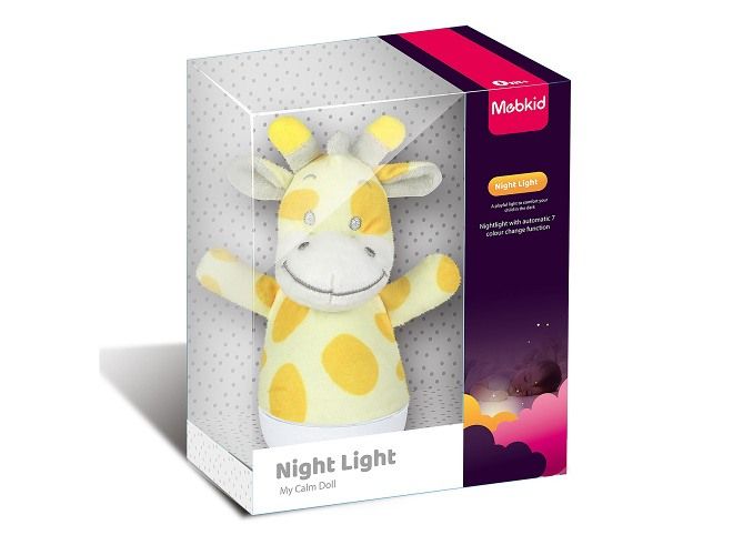 Lampička noční žirafa usínáček plyšový. Rozměry 11x8x15,5 cm. Aktivace přepínačem na spodní straně lampičky. Automaticky se měnící barevné světýlko (7 barev). 3xAAA (1. 5V) baterie, nejsou součástí.