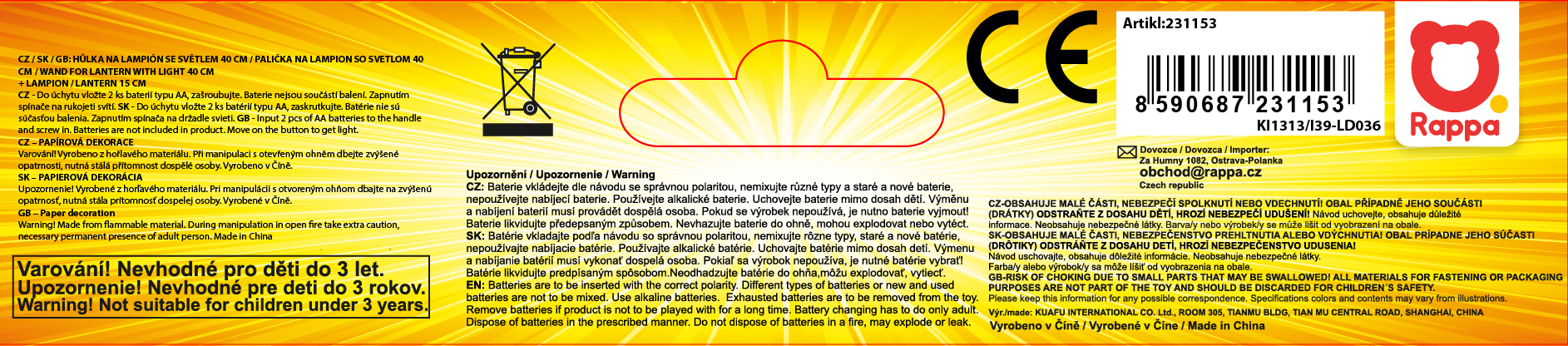 Papírový lampion s motivem ducha a k němu svítící hůlka! Oválný lampion je vyroben z papíru a ve spodní části se nachází úchyt pro čajovou svíčku. Tento super kousek ti zaručí parádní atmosféru na tvém halloweenském večírku nebo lampionovém průvodu! Hůlka vyžaduje 2 tužkové baterie typu AA, které nejsou součástí balení. Přepnutím spínače na rukojeti hůlka svítí.