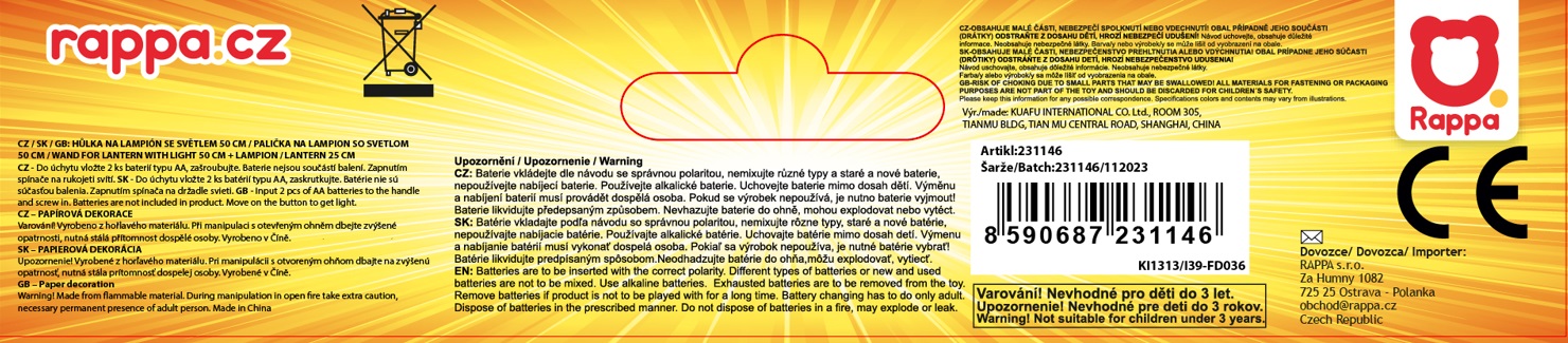 Papírový černý lampion s dýněmi a k němu svítící hůlka! Kulatý lampion je vyroben z papíru a ve spodní části se nachází úchyt pro svíčku. Tento super kousek ti zaručí parádní atmosféru na tvém halloweenském večírku nebo lampionovém průvodu! Hůlka vyžaduje 2 tužkové baterie typu AA, které nejsou součástí balení. Přepnutím spínače na rukojeti hůlka svítí.