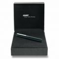 Psací nástroj, který je zosobněním všeho, co je tak typické pro značku Lamy - neotřelý, někdy až avantgardní design jdoucí ruku v ruce s unikátním technickým řešením. Rafinované technické zpracovaní otočného mechanismu pera, které brání potřísnění obleku inkoustem. Otočením dojde k vysunutí zlatého hrotu a zasunutí klipu do těla a naopak. Matné tělo s palladiovým povrchem, v kombinaci s doplňky pokovenými chromem. Plnicí pero: otočný mechanismus vysunovací zasunovací klip bez víčka dvoubarevný hrot z 14karátového zlata (ryzost Au 585/1000) zdobený platinou Dodáváno modrou bombičkou a standardním konvertorem s pístem pro plnění pera inkoustem z lahvičky, v dárkové kazetě.