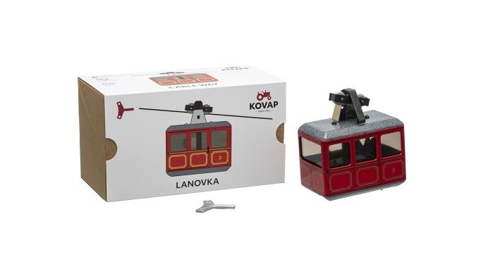 Originální hračka – model lanovky na klíček, který dokáže jezdit po provázku. Ujede asi 4 metry s maximálním převýšením 0,5 metru. Provázek je součástí balení. Pohon lanovky zajišťuje pérový strojek na klíček, který je vybaven brzdou, která spouští nebo zastavuje pohyb lanovky po provázku.