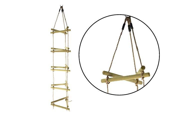 Lanový žebřík dřevěný trojhran. Délka 1,9 m. PE lana o průměru 10 mm. Délka úchopů 58 cm. Nosnost 80 kg.
