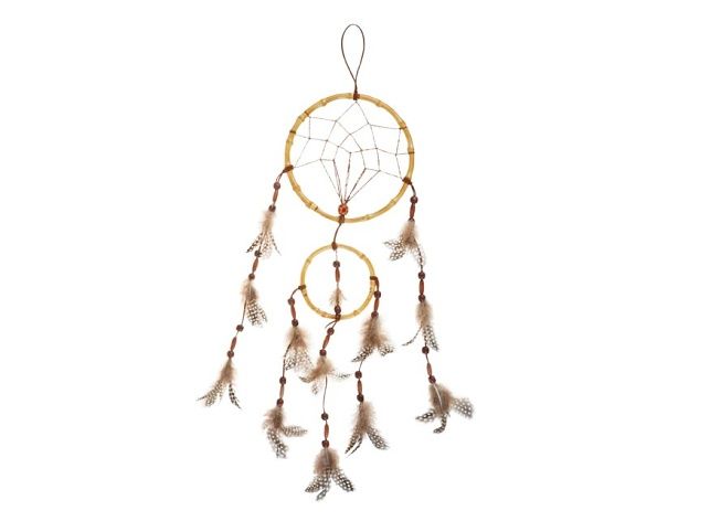Lapač snů - dekorace, kterou si zavěsíte volně do místnosti nebo nad postel, všechny noční můry se zachytí do sítě lapače a do rána budou rázem pryč. Lapač snů má dva kruhy (jeden menší a jeden větší) a kolem nich je omotaný provázek. Z provázku visí hnědé peříčka s korálky. Lapač má i provázek na zavěšení. Uvedená cena je za 1 ks.