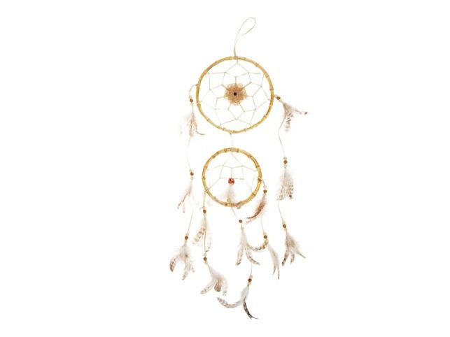Lapač snů - dekorace, kterou si zavěsíte volně do místnosti nebo nad postel, všechny noční můry se zachytí do sítě lapače a do rána budou rázem pryč. Lapač snů má dva kruhy (jeden menší a jeden větší) a kolem nich je omotaný provázek. Z provázku visí bílé peříčka s korálky. Lapač má i provázek na zavěšení. Uvedená cena je za 1 ks.