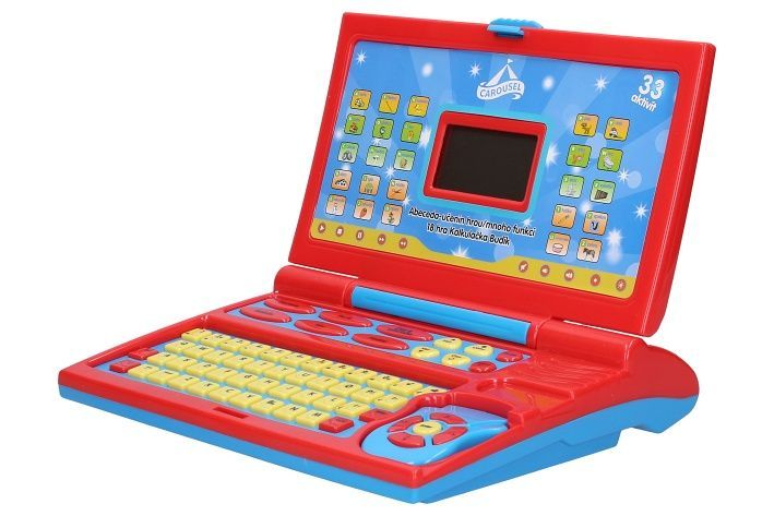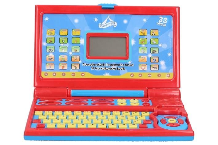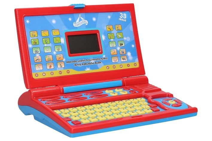 Laptop dětský - mluví česky. Rozměry 24x19,5 cm. Světelné a zvukové efekty. 3xAA baterie součástí. Součástí drátová myš. Tlačítko ON/OFF - aktivace displeje. Výuka abecedy, slov, čísel, melodie, hry, hodiny, opakovací funkce, nastavení hlasitosti, podsvícení displeje.