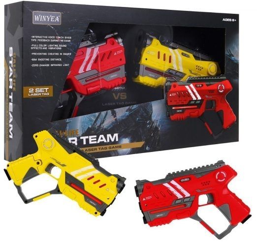 Užij si dokonalou akční hru doma i venku s těmito laserovými pistolemi. Vyzvi na souboj svého kamaráda a "sejmi ho" jako první. Laser hra pro dva hráče. Pistole vydávají světelné a zvukové efekty. Detekce střel až na 30m. Tři světýlka na zbrani signalizují, kolik zbývá životů. Svítící kroužek ukazuje, ve kterém týmu hráč je. Tlačítka pro výběr týmu a aktivaci střelby se nachází na levé straně zbraně. ON/OFF přepínač na levé straně zbraně. Balení obsahuje 2 pistole. Velikost pistole 22 cm. Doporučený věk: od 8let Napájení: 3xAAA v každé zbrani, 6xAAA celkem.