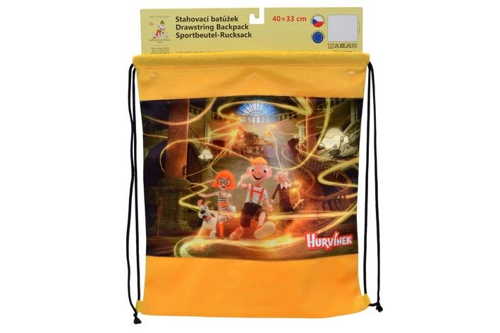Lehký látkový pytlík s motivem filmového Hurvínka, který šňůrkami stáhnete a můžete ho nosit na zádech jako batůžek. Rozměr 40x33cm. Objem cca 6 litrů. Nosnost 3 kg.