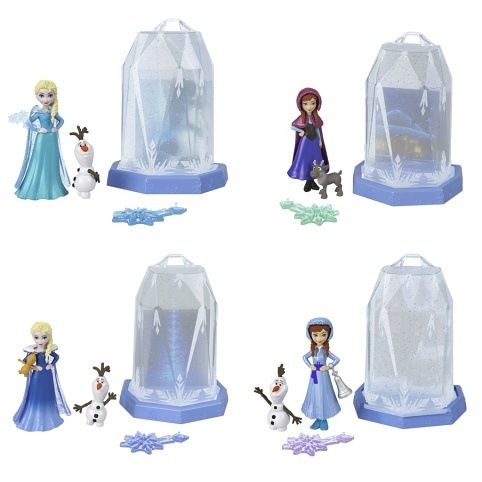 Tato kolekce malých panenek s překvapeními nabízí inovativní zážitek při rozbalování díky Squishy Ice™ – ledově modré želé směsi. Děti se pomocí přiložené lopatky prohrabou nádobkou se Squishy Ice™ a objeví poklady uvnitř: malou panenku Annu nebo Elsu, postavičku kamaráda a 4 hrací prvky.