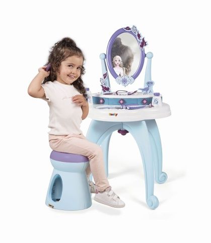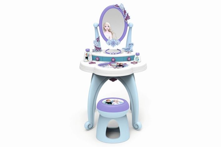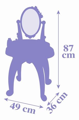 Robustní toaletní stolek se stoličkou a s velkým otočným zrcadlem je navržen v oblíbených barvách ledové královny Elsy a její sestry Anny. Součástí jsou lahvičky na parfémy, hřeben, čelenka, náhrdelník, hřeben do vlasů, náramek a 3 prsteny. Četné odkládací plochy jsou praktické a lze je využít k uložení veškerého příslušenství. Všechny použité materiály splňují nejvyšší požadavky na kvalitu pro dlouhou a bezstarostnou herní zábavu. Rozměry produktu (DxŠxV): 49 x 36 x 87 cm.
