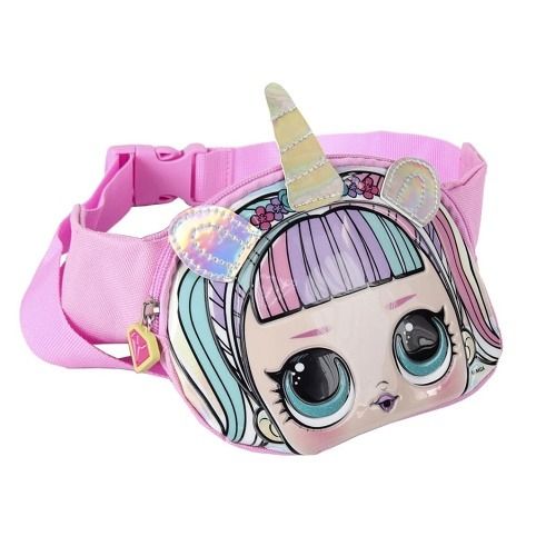 Dětská ledvinka 3D L.O.L. duhová. Přední strana panenka L.O.L. s rohem