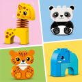 Posouvací model se zvířecím průvodem. Se slonem, tygrem, žirafou a pandou se malí milovníci zvířat rozhodně nebudou nudit. Mohou stavět a přestavovat model, měnit řazení vagónů a umisťovat do vláčku zvířata a vršit je na sebe. Přitom rozvíjejí jemnou motoriku a zkoumají magický svět kreativního hraní. Inovativní funkce, mezi něž patří i pohyblivý krk žirafy, přispívají k ještě zábavnějšímu zážitku z této edukační sady. Stavitelské kartičky s předlohami modelů ve skutečné velikosti dětem umožňují pokládat během stavění kostky přímo na obrázky. Pro ještě větší porci zábavy mohou děti vláček propojit s ostatními DUPLO modely na kolečkách.