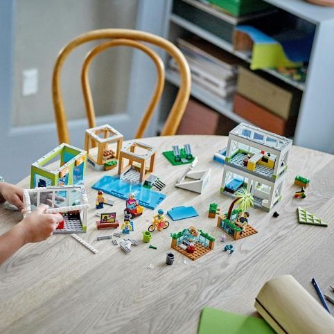 Prémiová stavebnice LEGO® City Bytového komplexu (60365) pro děti od 6 let nabízí kombinovatelné moduly pokojů s propracovaným interiérem pro nápadité hraní, obchod se smíšeným zbožím, obývací pokoj, kuchyni, ložnici a koupelnu s toaletou a vanou. Sada dá