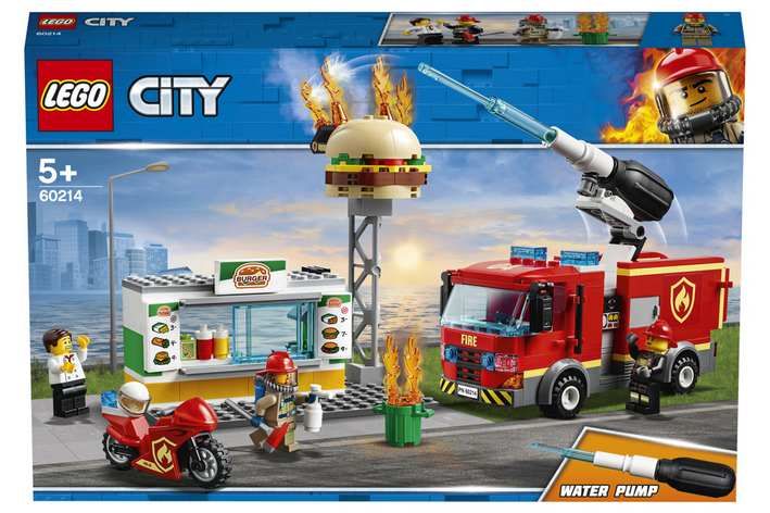 Obsahuje 3 LEGO® City minifigurky: 2 hasiče a šéfkuchaře z burgrárny. • Nabízí hasičský vůz s kabinou pro minifigurku, 2 úložnými prostory, rotující zadní částí a vodním dělem s funkcí „stříkání vody“, které vyjde v lednu 2019, a navíc i motorku. • Obsahuje budovu burgrárny s cedulí, posuvným obslužným okýnkem a odpadkovým košem. • Příslušenství zahrnuje požárnickou sekeru, která vyjde v lednu 2019, 2 přilby s otevíracím hledím, kyslíkovou bombu, odpadkový koš, motocyklovou helmu, malý hasicí přístroj a 5 sestavitelných dílků ohně. • Postav jeden nebo všechny dílky plamenů na ceduli burger baru a koš a bojuj s malým ohněm nebo zuřícím infernem! • Otoč zadní část hasičského vozu a zmáčkni měchy na vodním děle, abys vystřelil dílky vody a porazil plameny. • Burgrárna s cedulí měří přes 17 cm na výšku, 12 cm na šířku a 6 cm do hloubky. • Hasičský vůz se zataženým vodním dělem měří přes 8 cm na výšku, 15 cm na délku a 6 cm na šířku.