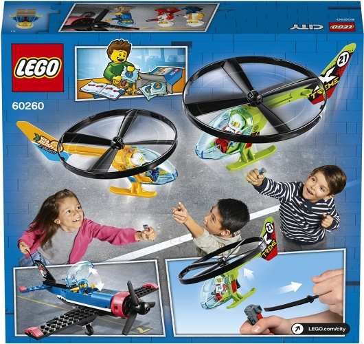 „• Sada LEGO® City Závod ve vzduchu, v níž naleznete 2 létající vrtulníky, 3 minifigurky, včetně hrdinů z televizního seriálu LEGO City Adventures, roztočí vrtule představivosti dětí. • Co vás čeká v krabici? Sada LEGO® City Závod ve vzduchu obsahuje 2 natahovací vrtulníky, kaskadérské letadlo, 2 traťové pylony a 3 minifigurky, včetně hrdinky z televizního seriálu LEGO City a pilotů Xtremea a Vitarushe. • Děti zatáhnou za lanko a vrtulník vzlétne do akce! Jak kaskadérské letadlo, tak vrtulníky mají otevírací kokpity, do kterých lze usadit jakoukoli ze 3 minifigurek této sady. • Sada Závod ve vzduchu (60260) od LEGO® City představuje skvělý vánoční, narozeninový nebo jakýkoli jiný dárek pro děti ve věku 5 a více let a pro kluky a holky, kteří milují modely vozidel. Vyžaduje pouze ty nejzákladnější stavební dovednosti. • Kaskadérské letadlo měří přes 8 cm na výšku, 20 cm na délku a 20 cm na šířku a vrtulník přes 7 cm na výšku, 18 cm na délku 12 cm na šířku. • Tato sada se obejde bez baterií – napínavý závod pohání dětská představivost. Potřebujete pomoc s nastartováním vrtulníků? Naskenujte QR kód v návodu ke stavění a podívejte se na videoprůvodce. • Tato závodní sada s letouny nabízí tištěný návod na stavění i úžasný zážitek Instructions PLUS – interaktivní návod, který pomůže dětem stát se opravdovými mistry. Instructions PLUS je k dostání v aplikaci s LEGO® návody na stavění. • Sady od LEGO® City na motivy letiště a letadel nabízí propracované budovy, parádní vozidla a zábavné postavy podněcující k tvořivému hraní. • Všechny stavebnice LEGO® City splňují ty nejvyšší oborové standardy a zároveň naše kritéria kvality, abychom zajistili, že LEGO kostky a dílky jsou konzistentní, kompatibilní a dají se kdykoli snadno spojovat a rozpojovat. • LEGO® kostky a dílky pouštíme na zem, zahříváme, drtíme, kroutíme a analyzujeme, takže si můžete být jisti, že všechny stavebnice pro děti splňují ty nejvyšší standardy bezpečnosti a kvality.“