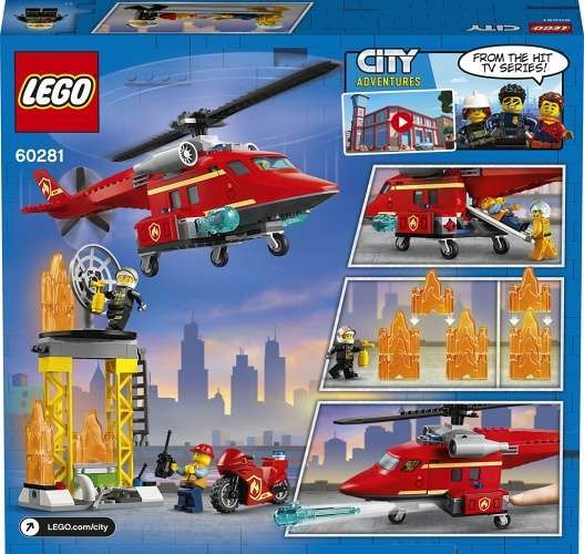 • Stavebnice Hasičský záchranný vrtulník (60281) je vhodná pro děti od 5 let, které milují požárnické modely, a pro fanoušky seriálu LEGO® City Dobrodružství. • Co se ukrývá v krabici? Vše, co děti potřebují k sestavení vrtulníku, motorky, elektrárny a LEGO® požáru, a k tomu navíc 3 minifigurky, včetně Clemmonse ze seriálu LEGO City Dobrodružství. • Děti mohou skládat LEGO® plameny na sebe, pokud budou chtít postavit větší oheň. Vodní děla vrtulníku umožňují vystřelování dílků, které požár uhasí, a 3 zábavné minifigurky ze seriálu LEGO City Dobrodružství jsou inspirací pro celou řadu příběhů. • Úžasný tip na dárek pro jakoukoli příležitost. Požárnická sada přináší fanouškům LEGO® City a tvořivým dětem od 5 let nekonečné hodiny zábavy. Vyžaduje pouze základní stavitelské dovednosti. • Po sestavení měří model hasičského vrtulníku přes 10 cm na výšku, 26 cm na délku a 9 cm na šířku. • LEGO® doplňky zahrnují nosítka (jsou uložená v nákladovém prostoru vrtulníku), požárnickou helmu, hasák a bezpečnostní helmu. • Součástí je srozumitelný tištěný návod na stavění a interaktivní návod pro začínající stavitele Instructions PLUS, který najdete v bezplatné aplikaci s LEGO® návody pro chytrá zařízení. • Hasičské sady od LEGO® City podporují kreativní hraní. Navíc nabízejí propracované budovy, parádní vozidla, zábavné postavy a prostředí, která poutavým a nápaditým způsobem zachycují reálný život. • Všechny LEGO® součástky splňují ty nejpřísnější oborové standardy tak, aby byly kompatibilní a umožňovaly hladké spojování a rozebírání. • Všechny LEGO® dílky procházejí náročnými testy, abychom mohli zajistit, že každá naše stavebnice splňuje přísné globální bezpečnostní standardy.