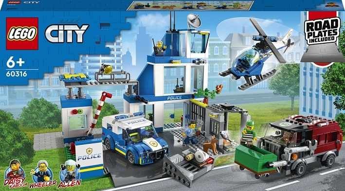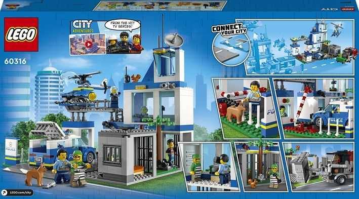 • Policejní stanice na motivy seriálu z prostředí LEGO® City – Sada Policejní stanice (60316) od LEGO City je doslova nabitá inspirací. Určeno dětem a fanouškům seriálu LEGO City Dobrodružství • Co se ukrývá v krabici? – Vše, co děti potřebují k sestavení 3podlažní policejní stanice, hlídkového vozidla, vrtulníku a popelářského auta, a k tomu navíc figurka psa a 5 minifigurek, včetně 3 postav z LEGO® City TV • Nepřeberné množství funkcí – Popelářské auto je vybaveno výtahem na popelnice a 2 „beranidly“ pro proražení zdi vězeňské cely. Nechybí ani křižovatka umožňující propojení s ostatními sadami LEGO® City • Dárek ke každé příležitosti – Tato policejní sada od LEGO® City poslouží jako narozeninový, vánoční nebo jakýkoli jiný dárek pro děti od 6 let • Výstavní modely – Po sestavení měří policejní stanice přes 27 cm na výšku, 28 cm na šířku a 24 cm do hloubky • Samozřejmostí jsou doplňky pro minifigurku LEGO® – Tato policejní sada nabízí celou řadu zábavných doplňků pro kreativní hraní, včetně dílků v podobě vysílačky, kamery, psí hromádky a koblihy • Samozřejmostí je interaktivní digitální návod na stavění – Díky aplikaci s návody LEGO® pro chytré telefony a tablety si děti mohou přibližovat, otáčet a prohlížet model ze všech úhlů • Rozvoj kreativních dovedností prostřednictvím stavění – Děti mohou hravým způsobem rozvíjet sebevědomí a klíčové dovednosti pro život • Důraz na kvalitu – Již od roku 1958 splňují všechny kostky LEGO® striktní oborové standardy, díky čemuž jsou konzistentní, kompatibilní a zaručují zábavné hraní • Bezpečnost na prvním místě – Kostky a dílky LEGO® pouštíme na zem, zahříváme, drtíme, kroutíme a analyzujeme, abychom zajistili, že splňují striktní globální bezpečnostní standardy