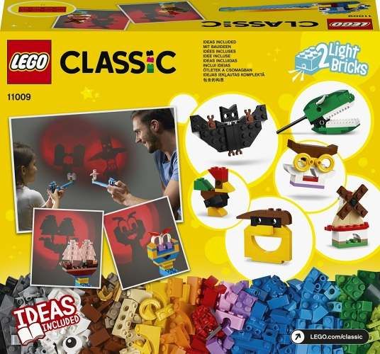 • Ukažte dětem svět stavitelské zábavy s těmito 12 malými modely a pak sledujte, jak s nimi vykouzlí úžasné stínové představení! Dvě světelné kostky nabízí nekonečné herní možnosti. • 12 sestavitelných LEGO® modelů – hrad, legrační obličej, princezna, netopýr, kohout, padouch, pirátská loď, sova, duch, větrný mlýn, žralok a dinosaurus – a navíc spousta dalších kostek, ze kterých si děti mohou postavit své vlastní výtvory. • Děti si postaví model, budou si s ním hrát a poté s pomocí světelných kostek rozehrají nekonečně kreativní a zábavné stínové divadlo plné úžasných příběhů. • Tato stavebnice představuje skvělý vánoční, narozeninový nebo jakýkoliv jiný dárek pro děti od 5 let, které si stavění s LEGO® kostkami a přehrávání příběhů ve stínovém divadle doslova zamilují. • Stínové divadlo měří přes 22 cm na výšku a mohou ho snadno ovládat i malé ručky dětí. Kromě 12 sestavitelných modelů sada nabízí kostky navíc, aby si děti mohly stavět své vlastní výtvory. • Součástí jsou baterie do světelných kostek (2× LR41), takže děti mohou okamžitě začít s promítáním stínových příběhů. Stavění z kostek však pohání výhradně dětská představivost. • Je toto ideální dárek pro začátečnického LEGO® stavitele? Bez obav! Díky jednoduchému návodu si děti ihned začnou užívat. A pokud se návod nedopatřením ztratí, můžete si jej stáhnout ze stránky LEGO.com/buildinginstructions. • Stavebnice LEGO® Classic podněcují k neomezenému hraní s bláznivou směsicí kostek, dílků, nápadů a inspirace. Podpořit děti v rozvíjení kreativity ještě nikdy nebylo snazší a zábavnější! • Již od roku 1958 splňují LEGO® stavebnice ty nejvyšší standardy tak, aby byly konzistentní, kompatibilní a umožňovaly snadné skládání a rozebírání. • Krom vyhovění nejvyšším standardům kvality a bezpečnosti testujeme LEGO® kostky i u nás v LEGO Group, a tak je mačkáme, kroutíme, zahříváme, ohýbáme, škrábeme a natahujeme, abyste si mohli být jistí, že jsou pro vaše dítě opravdu bezpečné.