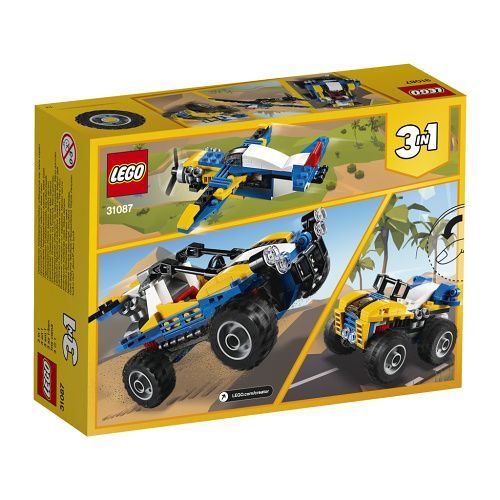 Vychutnej si 3 stavební příležitosti s touto sadou LEGO® Creator 3 v 1. Postav buginu do dun a přestav ji na rychlé letadlo, na jehož palubě můžeš vzlétnout do vzduchu, nebo se proháněj drsným terénem na odolné čtyřkolce. • Bugina do dun nabízí barevný sportovní design s robustními pneumatikami, čelními světly, viditelným zadním motorem s přívodem vzduchu, velkým zadním spojlerem a výfukem, ale také propracovaný kokpit s červeným sedadlem pro řidiče, volantem a otevírací ochrannou klecí. • Podívej se na sportovní kombinaci modré, bílé a žluté barvy buginy do dun. • Závoď a proháněj se terénem v parádní bugině do dun! • Bugina do dun měří přes 7 cm na výšku, 13 cm na délku a 8 cm na šířku. • Letadlo měří přes 6 cm na výšku, 13 cm na délku a 14 cm na šířku. • Čtyřkolka měří přes 5 cm na výšku, 8 cm na délku a 6 cm na šířku.