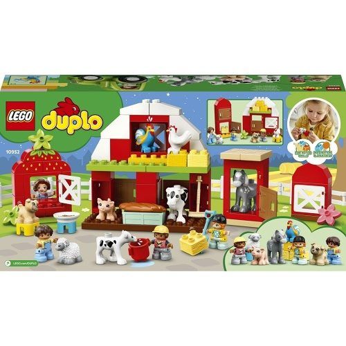 „Zažijte pořádný rozruch na farmě společně s těmi nejmenšími! Abyste mohli správně pečovat o zvířata, najdete zde vše potřebné. Stodola ani traktor nemohou chybět, stejně tak jako celá řada figurek zvířátek – poník, prasátko, pejsek, ovce, kohout a kuřátko i kráva s telátkem. Brrrm, brrrm, už to jede! Nechte děti dovézt zemědělským traktorem seno pro zvířata, které je uskladněno v sestavitelné stodole. Farma ožije ráno, v poledne i večer ať ji postavíte kdekoliv. Tato LEGO DUPLO sada přímo vybízí ke hrám, které rozvíjejí dětskou fantazii, a navíc si celou farmu mohou snadno vzít i s sebou na cesty. " "• Stavebnice obsahuje roztomilé figurky poníka, prasátka, pejska, ovce, kohouta, kuřete, krávy a telátka. • LEGO traktor, sestavitelná stodola, balík sena – nezbytnosti pro rušnou farmu součástí balení. • Určeno pro malé farmáře od 2 let, ale i předškoláky, kteří milují zvířata a traktory. • Ideální LEGO sada rozvíjející jemnou motoriku, sociální a emoční dovednost a kreativní myšlení.“