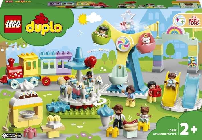 "Vydejte se společně se svou ratolestí na výlet do zábavního parku z edice LEGO® DUPLO® Město (10956) a objevte vzrušující nabídku atrakcí, které zaujmou a zabaví bystré dětské ručičky i hlavičky. Zábava na pouti pro celou rodinu > Připojte se k 7 DUPLO postavičkám, mezi kterými najdete 2 paní, 1 pána a 4 děti, a užijte si okouzlující edukativní zábavu na pouti! Tato všestranná hračka obsahuje skluzavky, kolotoč s mechanickým pohonem, velké ruské kolo se 3 barevnými kabinami, vláček a stánek s párky v rohlíku. Dále nechybí dílky zmrzliny, foťáku, balónků, dortíků, koštěte a medvídka. O dokonalou pouťovou atmosféru se pak postará speciální světelný dílek s barvami duhy. Tvořivá vzdělávací stavebnice pro nejmenší > Hračky LEGO DUPLO dětem nabízí neomezenou zábavu, možnost sebevyjádření a učení hrou. Díky stavebnicím DUPLO mohou být rodiče u významných vývojových milníků svých dětí, které prožijí, zatímco si budou vychutnávat dlouhé hodiny hraní a stavění." „• Užijte si zábavu s celou rodinou na pouti v zábavním parku LEGO® DUPLO®! • Obsahuje 2 skluzavky, kolotoč, ruské kolo, vláček, 7 figurek a světelnou kostku. • Mezi doplňky najdete párky v rohlíku, zmrzlinu, foťák, balónky, dortíky a medvídka. • Atrakce inspirují k neomezenému hraní a přináší pořádnou porci edukativní zábavy. • Rodiče mohou s ratolestmi, které už oslavily 2. narozeniny, sdílet důležité vývojové chvíle. • Přestavujte sadu k obrazu svému a kombinujte ji s ostatními modely z řady LEGO® DUPLO®. • Součástí návodu na stavění je také zábavný obrázkový příběh. • Všechny stavebnice LEGO® DUPLO® vedou děti k nápaditému hraní a podporují jejich vývoj. • Stavebnice LEGO® DUPLO® splňují nejvyšší oborové standardy kvality. • Kostky a dílky LEGO® DUPLO® splňují přísné normy týkající se dětské bezpečnosti.“