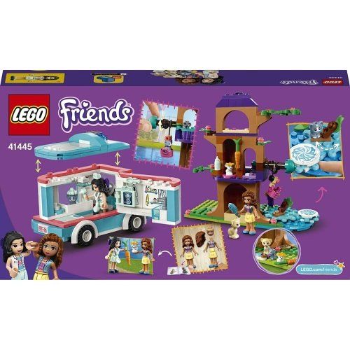 "Chcete dětským milovníkům zvířat dopřát hodiny šťastného hraní? Darujte jim stavebnici Veterinární sanitka (41445). Tato LEGO® Friends sada, která je doslova nabitá zábavnými prvky, obsahuje 2 minipanenky a představuje skvělý dárek pro holky a kluky, kteří mají rádi domácí mazlíčky. Okamžitá zábava > Díky spoustě inspirativních prvků se tato sada skvěle hodí ke každodennímu hraní. Děti mohou trávit čas v domku na stromě nebo podnikat napínavé akce na záchranu koťátka, které spadlo do řeky. Díky speciální funkci je možné řeku rozvířit, což přidá na dramatičnosti celé situace. Kocourka můžete zachránit pomocí kbelíku. Spousta realistických detailů > Sanitku lze otevřít a pokračovat ve hraní uvnitř vozu. Roztomilé doplňky dětem umožní postarat se o vylekané zvířátko. Představte dětem svět LEGO Friends, kde se naučí, že týmová práce je základem úspěchu." „• Zábavná stavebnice s modely domku na stromě a zvířecí sanitky. • Obsahuje 2 minipanenky a figurky 2 koček a 1 králíka. Nechybí ani spousta doplňků. • Děti mohou zachránit kočičího kamaráda z peřejí a postarat se o něj ve zvířecí sanitce. • Tato sběratelská stavebnice představuje skvělý dárek pro všechny děti. • Modely jsou kompaktní a skvěle se hodí na výstavku. • Sanitka má boční panel, přes který se mohou dětské prsty dostat dovnitř. • Zábavné funkce pohltí děti do napínavého hraní. • Pokud děti nemají hraní dost, mohou model kombinovat s ostatními stavebnicemi od LEGO® Friends. • Dílky ze stavebnic LEGO® Friends jsou vyráběny z vysoce kvalitních materiálů.“