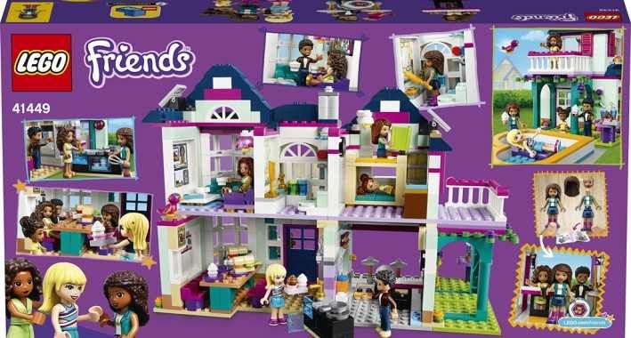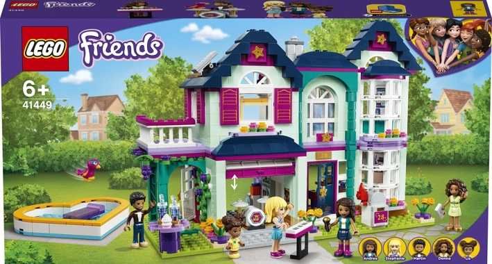 • Ohromte malé stavitele 3podlažním modelem Andrea a její rodinný dům (41449) od LEGO® Friends.Děti si díky této prémiové sadě mohou vyzkoušet parádní funkce a hrát si na rodinný život. • Tato nádherná stavebnice s 5 minipanenkami kamarádek LEGO® Friends obsahuje kompletní rodinu postav, včetně mikropanenky (novinka pro leden 2021), které inspirují i vaši rodinu k neomezené zábavě. • Děti mohou v garážovém studiu uspořádat koncert pro sousedy, poflakovat se v Andreině pokojíčku, smočit se v bazénu nebo připravit jídlo v moderní kuchyni. • Ekologicky uvědomělé děti budou nadšené solárními panely na střeše, které budou v budoucnu čím dál častější. Stejně jako všechny modely domů od LEGO Friends® je i tento nabitý parádními doplňky. • Sada je prakticky navržená tak, aby se s ní dobře hrálo. Horní patro je odnímatelné, aby děti měly přístup k tomu spodnímu. Pracovní stůl v kuchyni lze vyklopit, takže se malé prstíky snadno dostanou dovnitř. • Hledáte narozeninový dárek pro dítě, které má rádo modely domů? Kluci i holky od 6 let si s radostí rozbalí tuto prémiovou sadu a podělí se o zábavné zážitky se svými kamarády. • Kreativní model měří přes 20 cm na výšku, 26 cm na šířku a 12 cm do hloubky. Na výstavce zaujme, ale zároveň nezabere zbytečně mnoho místa. • Uveďte moderní děti do přívětivého světa LEGO® Friends, kde na každém záleží a každý je vítán. • Tento LEGO® model domu splňuje ty nejpřísnější oborové standardy tak, aby použité kostky byly kompatibilní a umožňovaly hladké spojování a rozebírání – a je tomu tak již od roku 1958. • Kostky a součástky použité v tomto domku pro minipanenky jsou testovány tak, aby splňovaly ty nejpřísnější globální standardy bezpečnosti a kvality.