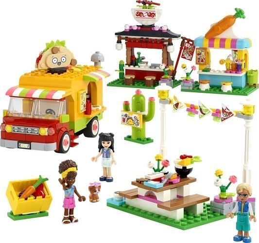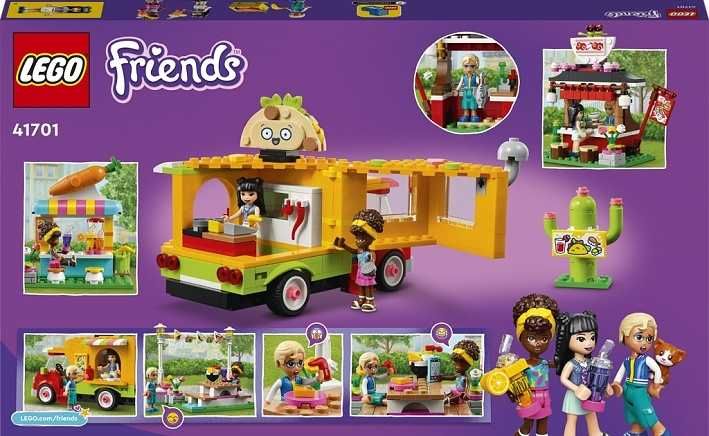 • Kreativní dárek, který je oslavou jídla z celého světa – Malí gurmáni se jistě rádi seznámí s mezinárodní nabídkou potravin v sadě Pouliční trh s jídlem (41701) od LEGO® Friends. Zváni jsou samozřejmě i jejich kamarádi • Hromada zábavných doplňků – Stavebnice tvořená 592 dílky obsahuje 3 minipanenky, včetně Emy z LEGO® Friends, a dále nechybí food truck s tacos, džusový bar, sushi stánek, jídelní oblast, cedule s kaktusem a figurka koťátka • Interaktivní hraní – Minipanenky mají vyměnitelné hlavy s různými výrazy, takže si děti mohou užít spoustu zábavy při domýšlení, co si postavy o různých potravinách myslí. Model vozu je otevírací pro snadný přístup • Nepřeberné množství doplňků – Mísa s ramenem a vajíčkem na vrchu, sushi, hůlky, vidlička, misky s dipy, ovoce, chilli a guacamolový dip dodají dětským hrám nádech realističnosti • Módní narozeninový dárek pro děti od 6 let – Ideální pro kluky a holky se zájmem o nejnovější trendy. Zábavný dárek k narozeninám pro malé gurmány, kteří rádi tráví čas s přáteli • Zábava na dosah ruky – Food truck měří přes 11 cm na výšku a 16 cm na délku. Model je tak dostatečně malý na to, aby mohl zůstat na výstavce připravený k dispozici pro případ, že děti přepadne hlad po LEGO® kostkách • Stavění v digitálním věku – Součástí jsou interaktivní pokyny Instructions PLUS dostupné v bezplatné aplikaci s návody na stavění LEGO®, kde si děti během sestavování mohou své modely digitálně přibližovat, otáčet a vizualizovat • Každý je vítán – Uveďte děti do barevného světa stavebnic LEGO® Friends, kde se mohou věnovat své vášni a poznávat nové kultury z pohodlí pokojíčku • Vždy dokonale funkční – Již od roku 1958 splňují dílky LEGO® striktní oborové normy, aby byly konzistentní, kompatibilní a umožňovaly snadné spojování a rozebírání • Buďte v klidu, zatímco si děti hrají – Populární stavebnice LEGO® procházejí náročnými testy, aby splňovaly neúprosné bezpečnostní normy