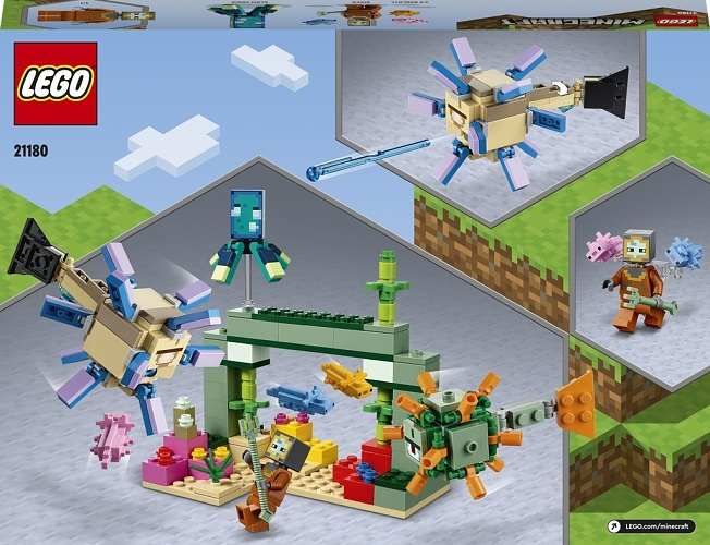 • Dobrodružství pod hladinou – Stavebnice Bitva se strážci (21180) od LEGO® Minecraft® vezme hráče na kreativní misi na mořském dně plnou postav a funkcí z vysoce populární hry • Autentická akce – Sestavitelný korálový útes a monument nabízejí také kultovní postavy ze hry Minecraft®: potápěče, svítící chobotnici, strážce, staršího strážce a 3 axolotly • Kreativní hraní – Postavte si korálový monument, najděte poklad a utkejte se s protivníky v dobrodružném světě Minecraft®, který děti zcela pohltí • Všestranný dárek – Sada doslova překypuje herními možnostmi, které jistě zaujmou a pobaví fanoušky Minecraftu od 8 let • Neomezené možnosti – Kreativní sada měří přes 12 cm na výšku, 12 cm na šířku a 7 cm do hloubky • Minecraft® v reálném světě – Stavebnice řady LEGO® Minecraft přinášejí fanouškům nový způsob, jak si vychutnat jejich oblíbenou hru. Součástí jsou postavy, scény a funkce tvořené pestrým mixem kostek a dílků LEGO • Záruka kvality – Součástky LEGO® splňují striktní oborové standardy kvality tak, aby byly konzistentní, kompatibilní a umožňovaly snadné spojování a rozebírání • Jistota bezpečnosti – Dílky LEGO® pouštíme na zem, zahříváme, drtíme, kroutíme a analyzujeme, abychom zajistili, že splňují náročné globální bezpečnostní standardy