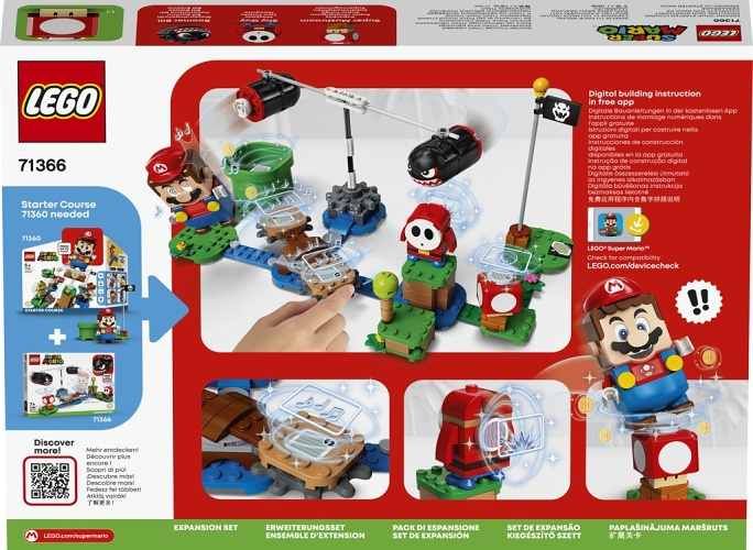 • Děti si zamilují akční překážky, které získají díky rozšiřující stavebnici Palba Boomer Billa (71366), a se svým startovacím setem LEGO® Super Mario™ Dobrodružství s Mariem si tak užijí ještě více legrace. • Tato jedinečná stavebnice LEGO® Mariovi (figurka není součástí balení) postaví do cesty otočnou plošinu, 2 „létající" Boomer Billy, Shy Guye a Super Mushroom pro ještě více možností. • Na plošině hráči umístí LEGO® Maria (figurka není součástí balení) na část s výstupky nebo na hladkou plochu pro ještě větší obtížnost. Kolikrát se jim povede otočit LEGO Maria, aniž by spadl nebo byl sražen Boomer Billem? • Tato kreativní LEGO® stavebnice se 132 dílky skvěle poslouží jako zábavný dárek k narozeninám či jiné příležitosti pro děti ve věku od 7 let, které vlastní startovací set Dobrodružství s Mariem. Rozšiřující set je inspiruje ke stavění a přizpůsobení vlastní jedinečné herní úrovně. • Model v základním rozložení měří přes 11,5 cm na výšku, 24 cm na šířku a 20 cm do hloubky. Lze jej přestavovat a kombinovat se startovacím setem a dalšími rozšiřujícími stavebnicemi. • Tato rozšiřující stavebnice nevyžaduje žádné baterie – ožije při hraní s figurkou LEGO® Maria ze startovacího setu. • V rámci bezplatné aplikace LEGO® Super Mario™ děti najdou digitální návod na stavění, skvělé interaktivní nástroje pro zobrazování modelu a spoustu nápadu na kreativní hraní. Seznam kompatibilních zařízení se systémem Android a iOS najdete na stránkách LEGO.cz/devicecheck. • Tvůrčí stavebnice LEGO® Super Mario™ přivádí legendární postavičku do reálného světa. Fanouškům umožňují rozšiřovat a přestavovat vlastní úrovně, a tvořit tak jedinečné výzvy pro jednoho hráče nebo soutěže pro přátele a rodinu. • K rozpojování LEGO® kostek nebudete potřebovat nadpřirozené síly Super Star! Splňují ty nejvyšší oborové standardy a vždy je lze snadno spojit a rozpojit. O své modely se navíc nemusíte bát, neboť dílky spolehlivě drží. • LEGO® kostky a dílky testujeme téměř všemi představitelnými způsoby, takže si můžete být jisti, že tato sběratelská stavebnice splňuje ty nejvyšší standardy bezpečnosti a kvality.