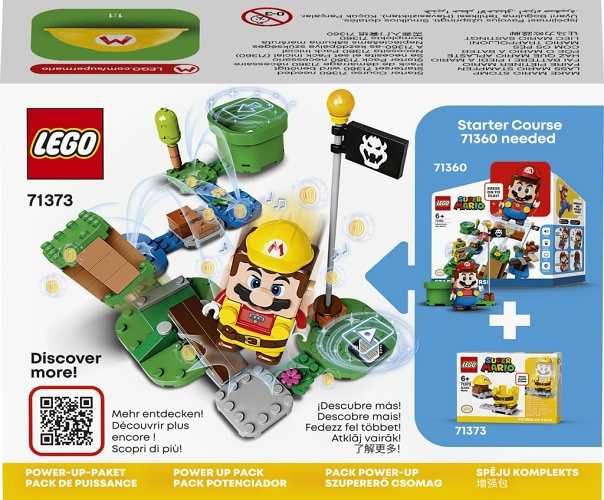 • Díky tomuto interaktivnímu oblečku pro LEGO® Maria (71373) si děti užijí legraci při skákání po kostkách a sbírání mincí během napínavých her ve světě LEGO Super Mario™. • Sestavitelný obleček pro LEGO® figurku Maria, která je součástí startovacího setu Dobrodružství s Mariem (71360), přináší spoustu nových herních možností. • Když je LEGO® Mario™ (figurka není součástí balení) vybaven tímto doplňkem, hráč může získat digitální mince tím, že bude skákat po LEGO kostkách v postavených herních úrovních. • Tento LEGO® set s 10 dílky představuje báječný dárek k narozeninám či jakékoliv jiné příležitosti pro kreativní děti a fanoušky ve věku od 6 let, které si díky němu mohou užít ještě více legrace s jejich startovací stavebnicí Dobrodružství s Mariem (71360) a rozšiřujícími sety. • Startovací stavebnici LEGO® Mario™ můžete rozšířit o další sady doplňků, včetně setů Ohnivý Mario – obleček (71370), Létající Mario – obleček (71371) a Kocour Mario – obleček (71372). • Tato zábavná kreativní stavebnice nevyžaduje žádné baterie – stačí doplněk obléct LEGO® Mariovi ze startovacího setu a hra rázem ožije. • Součástí stavebnice je ilustrovaný návod, takže děti zvládnou stavět bez pomoci. • Děti si rovněž zamilují bezplatnou aplikaci LEGO® Super Mario™, v níž najdou návody na stavění a nápady na kreativní hraní a která slouží jako bezpečné prostředí pro sdílení nápadů. Seznam kompatibilních zařízení se systémem Android a iOS najdete na stránkách LEGO.cz/devicecheck. • Sběratelské stavebnice LEGO® Super Mario™ jsou vhodné jak pro hraní v jednom, tak pro skupinová klání. Jedinečným způsobem přivádí k životu oblíbenou postavu a nabízejí neomezené kreativní výzvy. • Již od roku 1958 splňují LEGO® kostky ty nejvyšší oborové standardy zaručující konzistenci a kompatibilitu. Lze je vždy jednoduše spojit a zase rozpojit, takže nemusíte mít nadpřirozené síly super hvězdy! • LEGO® kostky a dílky přísně testujeme a analyzujeme, abychom zajistili, že všechny LEGO stavebnice splňují ty nejpřísnější normy z hlediska bezpečnosti a kvality.