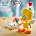 LEGO® sada 40824 představuje postavičku Roztomilého Tweetyho z populárního seriálu Looney Tunes™, která je navržena jako zábavný a detailní model pro fanoušky všech věkových kategorií od 12 let výše. Stavebnice obsahuje celkem 412 dílků, z nichž je možné sestavit figurku vysokou přes 17 cm s výraznými žlutými a oranžovými barvami, které věrně kopírují originální vzhled oblíbené postavičky. Charakteristické oči a peří jsou vyvedeny pomocí speciálních LEGO dílků, které dodávají modelu živý a přátelský výraz. Tento model nabízí možnost přeměny vzhledu Tweetyho pomocí různých doplňků. Mezi ně patří kytice z růžových a červených květů, červené srdíčko na průhledném držáku a také Amorův luk s šípem zakončeným červeným srdcem. Figurku lze umístit na bílý oblý podstavec připomínající obláček, který je ozdoben několika srdíčky na průhledných tyčkách, což podtrhuje romantickou valentýnskou atmosféru stavebnice. Model je vyroben z kvalitních plastových dílků LEGO, které jsou pevné a snadno se sestavují. Díky variabilitě a detailnímu zpracování je stavebnice nejen zábavná na skládání, ale také krásným výstavním kusem vhodným jako dárek k narozeninám nebo jiným zvláštním příležitostem, zejména k Valentýnu. Sada kombinuje kreativitu, nostalgii po známé kreslené postavičce a tematický prvek lásky, což ji činí atraktivní pro děti, teenagery i dospělé sběratele.