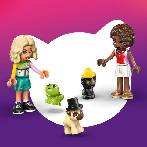 LEGO® sada 42678 Friends Dodávka s doplňky pro mazlíčky je určena dětem od 6 let a nabízí 237 dílků pro kreativní stavění a hraní. Hlavním modelem je stylizovaná dodávka ve veselých barvách žluté a tyrkysové, která je navržena tak, aby připomínala mopsíka. Dodávka má charakteristické detaily jako obličej s vystouplým čenichem, růžový jazyk a pohyblivý ocas, který se při jízdě kývá, což přidává hře na autentičnosti a zábavnosti. Zadní část vozidla je otevřená a poskytuje prostor pro nakládání různých doplňků a mazlíčků. Součástí stavebnice jsou dvě minipanenky, které představují postavičky Hopper a Aliya, a tři zvířecí figurky – roztomilý pejsek mops, černá kočička a malá zelená žabka. Každý mazlíček může být doplněn o různé pokrývky hlavy, například kovbojský klobouk, cylindr, růžový klobouček a žlutou přilbu, což umožňuje dětem rozvíjet představivost a vytvářet vlastní příběhy. Kromě figurek obsahuje sada i různé drobné doplňky jako stojan s nabídkou služeb a kost ve tvaru billboardu s nohami. Hra s touto sadou nabízí nejen stavění, ale i scénky s módní přehlídkou mazlíčků a jejich dobrodružstvími. Dodávka má realistické prvky, jako jsou otevírací dveře a prostor pro umístění figurek uvnitř vozidla. Děti mohou využít také aplikaci LEGO Builder, která jim pomůže s intuitivním stavěním díky 3D návodům a možnostem otáčení a přibližování modelu. Tento produkt je ideální pro malé milovníky zvířat a fanoušky série LEGO Friends, kteří chtějí rozvíjet svou kreativitu a hravou formou poznávat svět mazlíčků.