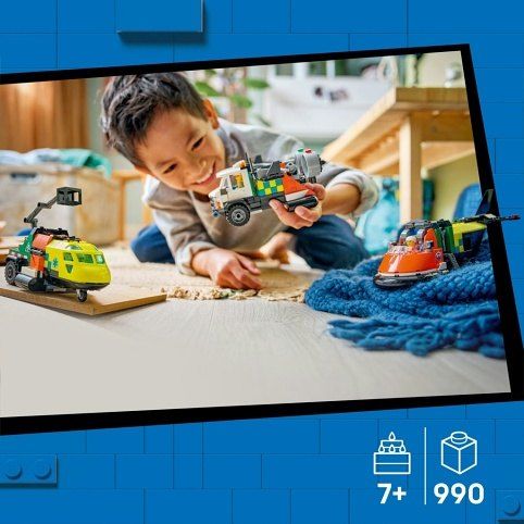 LEGO® 60505 City Remix představuje stavebnici určenou dětem od 7 let, která nabízí možnost vytvořit tři akční záchranná vozidla – letadlo, servisní vůz a vznášedlo pobřežní hlídky. Každý z těchto modelů je sestaven z modulárních dílů, které je možné mezi sebou kombinovat a vytvářet tak nové varianty vozidel podle vlastní fantazie. Stavebnice obsahuje celkem 990 dílků, je proto vhodná pro děti s určitou zručností, které mají rády kreativní a interaktivní hru. Letadlo je charakteristické žluto-černou barevnou kombinací s modrými a zelenými detaily a je vybaveno dvěma vrtulemi na křídlech. Servisní vůz má robustní vzhled s bílou kabinou a zeleno-černou korbou, na které je umístěna zvedací plošina s košem pro figurku, což rozšiřuje možnosti hry. Vznášedlo je oranžové s černou spodní částí a je vybaveno dvěma velkými ventilátory, které napodobují jeho pohyb na vodní hladině. Součástí sady jsou také tři minifigurky – řidič, člen pobřežní hlídky a zdravotník – které přinášejí do hry další prvky role-play. Díky modulární konstrukci a systému Mix & Match si děti mohou přizpůsobit jednotlivé části vozidel, což podporuje kreativitu a rozvíjí jemnou motoriku. Kromě tradičního stavebního zážitku mohou děti využít také aplikaci LEGO Builder, která je provede krok za krokem stavbou a umožňuje prohlížet modely ve 3D. Tato stavebnice LEGO City je vhodná jako dárek pro děti, které mají rády záchranářská témata a dynamické hry s vozidly. Je kompatibilní s dalšími sadami LEGO City, což otevírá možnost vytváření rozsáhlejších scénářů dobrodružství a rozšiřování sbírky. Celkově sada kombinuje zábavu, edukaci a rozvoj dovedností, přičemž nabízí mnoho hodin kreativní zábavy.